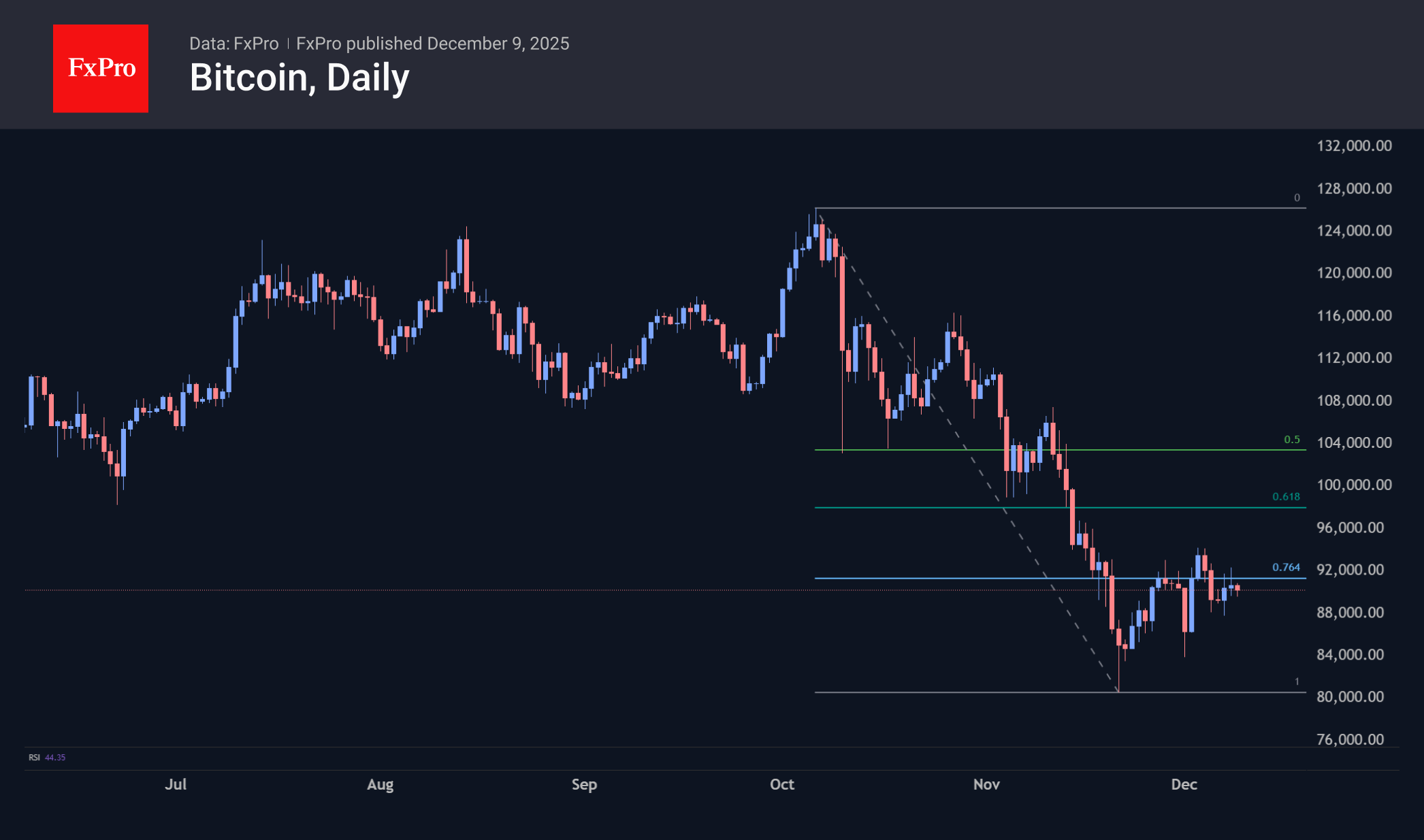 Bitcoin is trading near $90K, having crossed this level for the fifth consecutive day. An upward trend line can be drawn through the lows of late November, but BTC is now trading dangerously close to this line. At the same time, horizontal resistance has formed in the $92K area, bringing the positions of bulls and bears closer together over time and promising a decisive battle by the end of this week. It could not only be the last significant battle of the year but also determine the trend for the coming months.