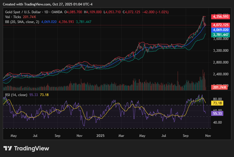 Gold slumped to near $4,065 in early Asian trading, down over 1% on the day as traders locked in profits after a record-setting rally. Optimism over renewed US-China trade negotiations weighed on safe-haven assets like gold.