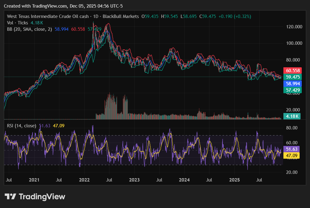 WTI crude trades around $59.45, holding below $60 amid rising US stockpiles signaling excess supply. Fed rate cut bets provide downside cushion.