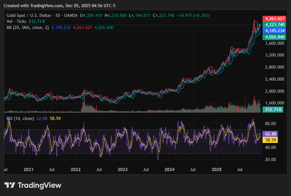 Gold price (XAU/USD) trades flat near $4,205 during early Asian hours. Rising US Treasury yields and strong US jobs data limit upside ahead of the delayed US PCE inflation report.