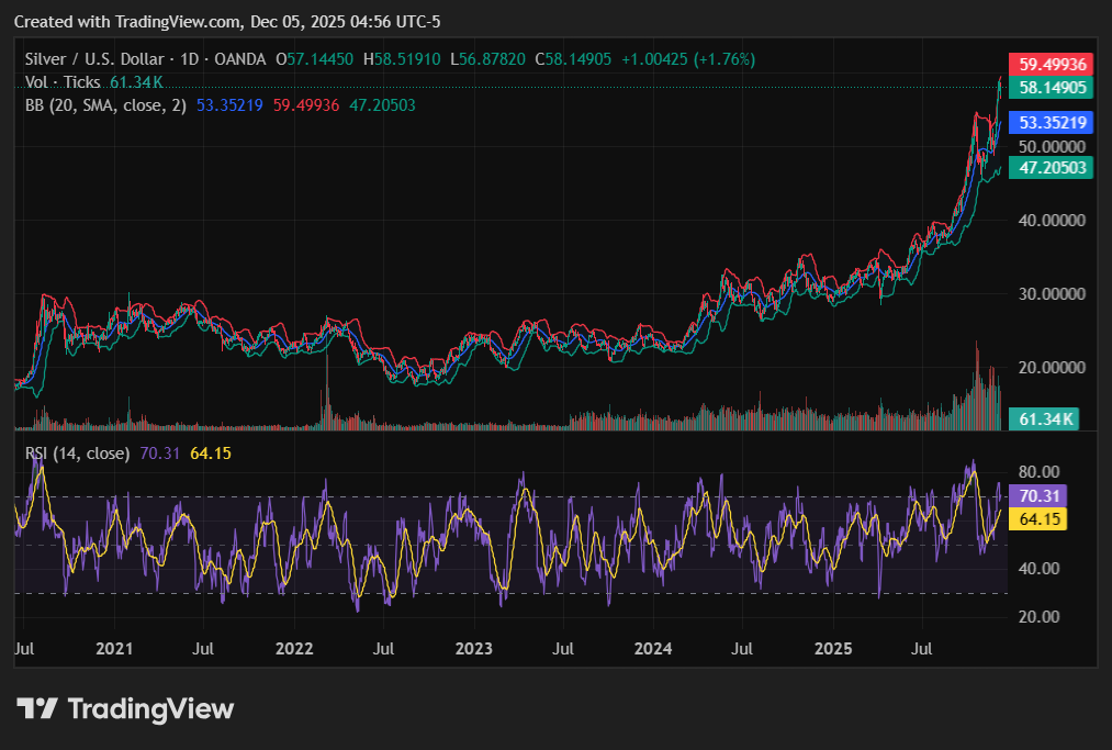 Silver price (XAG/USD) rises 0.5% to near $57.50 after correcting from $58.90 all-time high. Gains stem from firm dovish Fed cut expectations.