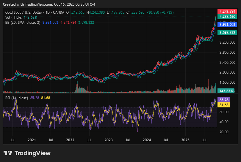 Gold climbed above $4,200, extending gains as traders priced higher odds of Fed rate cuts and leaned into safe-haven assets amid renewed geopolitics and shutdown risk. The metal’s advance is broad-based, supported by dollar softness and higher real-term demand from investors seeking inflation/monetary-policy hedges.