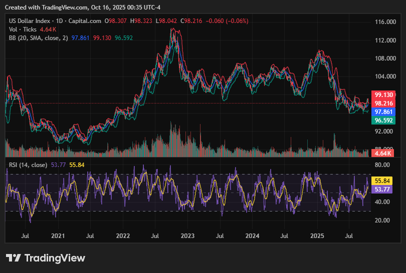 The US Dollar Index has slid to just above a one-week low (mid-98s), reflecting softer US yield dynamics and growing Fed-cut bets. The decline has boosted commodity prices and GBP/EUR/commodity-linked FX, though DXY remains sensitive to any reversal in risk sentiment.