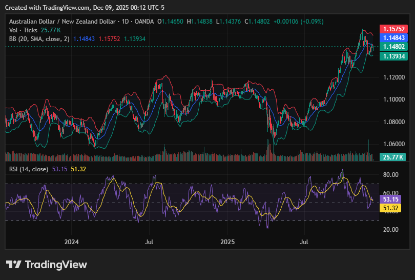 Forecast: Unless AUD gets a hawkish surprise or NZD weakens, expect AUD/NZD to test 1.1400–1.1350 in the near term.