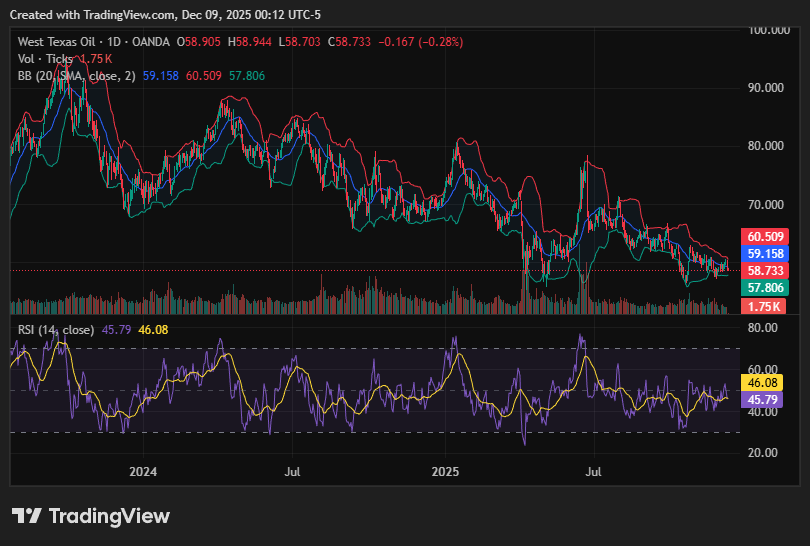 Trend: Mildly bearish/neutral — WTI trades just below $60 after a short-term rally, but limited upside remains.