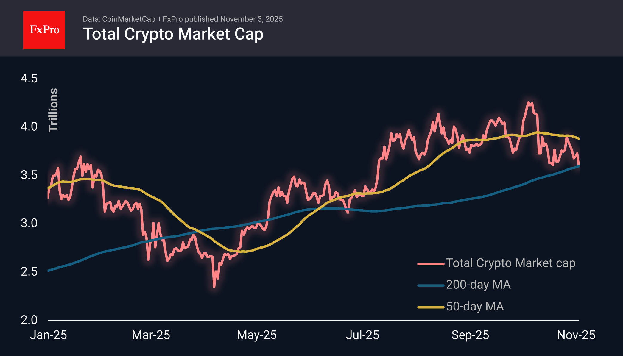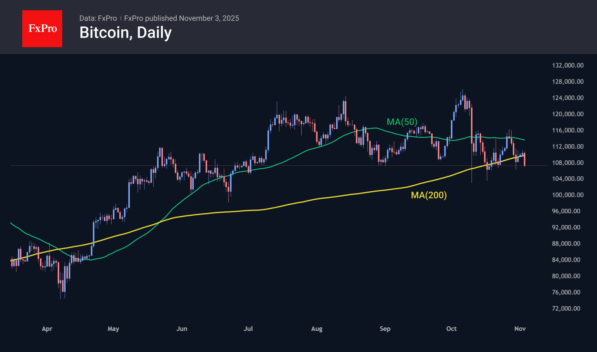 Bitcoin started the week and month with another attempt to dip below the 200-day moving average, falling back to $107K. The ongoing testing of support since the second half of October is a significant reason for our caution regarding the market in the near term. The most pessimistic scenario would be realised in the event of simultaneous pressure on the stock markets and a strengthening of the dollar. But optimists may also note the sequence of higher lows at the peaks of the sell-off.