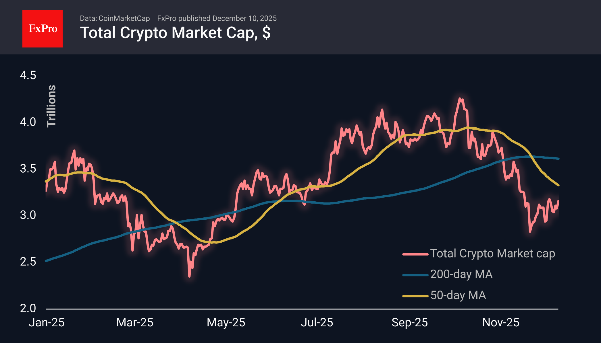The crypto market capitalisation increased by 2.5% to $3.16 trillion following Bitcoin's surge, surpassing the previous local maximum of over $3.21 trillion. Strictly speaking, we have observed a series of higher local highs and lows since 21 November. Moreover, the market is moving beyond the medium-term downward range that has dominated since early October. However, to definitively classify the rebound as the start of capitalisation growth, it needs to surpass $3.32 trillion, which is 6% above current levels.