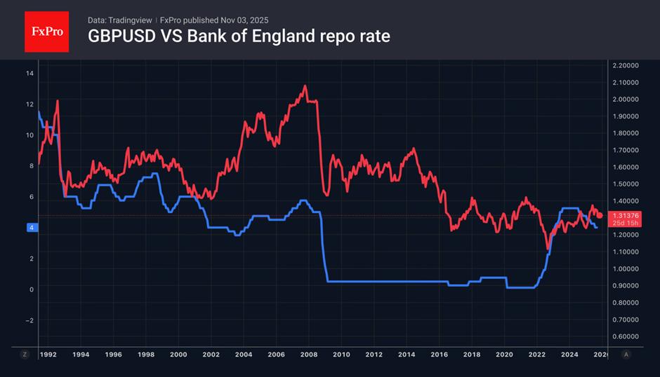 Goldman Sachs is calling on the BoE to cut rates at its meeting on 6 November. The futures market estimates the chances of this outcome at 1 in 3. At the same time, the split in the MPC signals that the central bank may indeed return to cutting rates. As a result, GBPUSD fell below 1.31 at the end of the week, its lowest level since April.