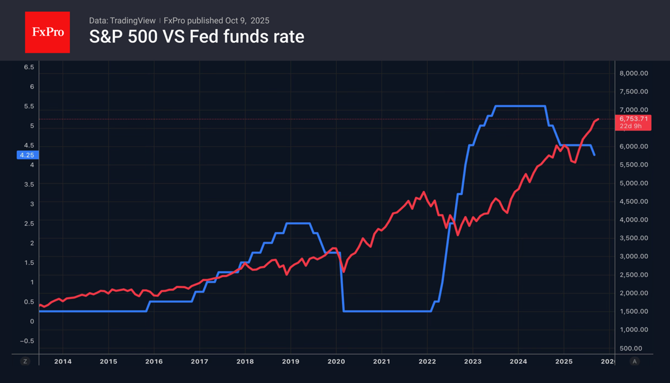 The shutdown adds uncertainty. On the one hand, the Fed is not receiving important data for lowering rates. On the other hand, alternative statistics signal a weakening jobs market and push the central bank towards further policy easing.