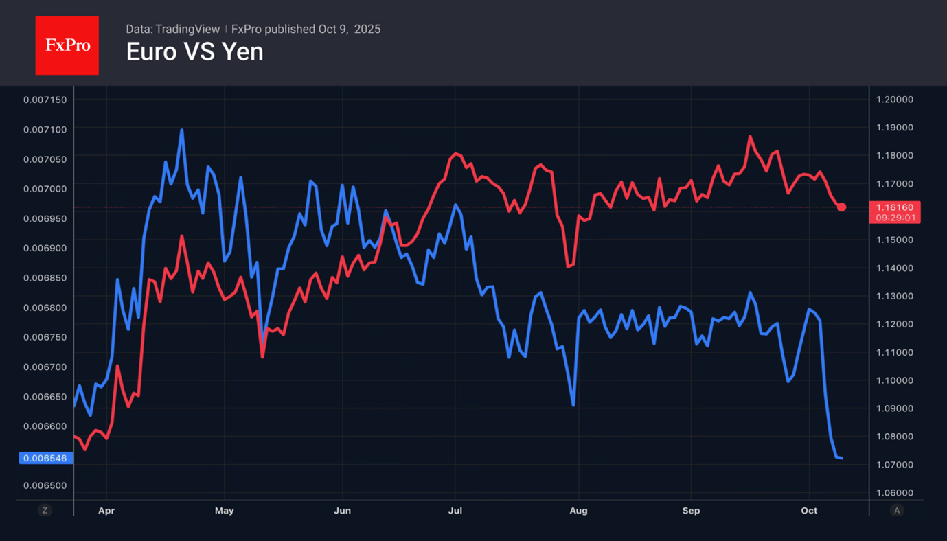 The US dollar continued its advance thanks to the weakness of its competitors. The political crisis in France has heightened the risks of early parliamentary elections and the potential resignation of Emmanuel Macron as president, thereby putting pressure on the euro. The new leader of the Liberal Democratic Party and soon-to-be Prime Minister of Japan, Sanae Takaichi, supports fiscal stimulus and opposes interest rate hikes. Doubts about the central bank's independence have weakened the yen.