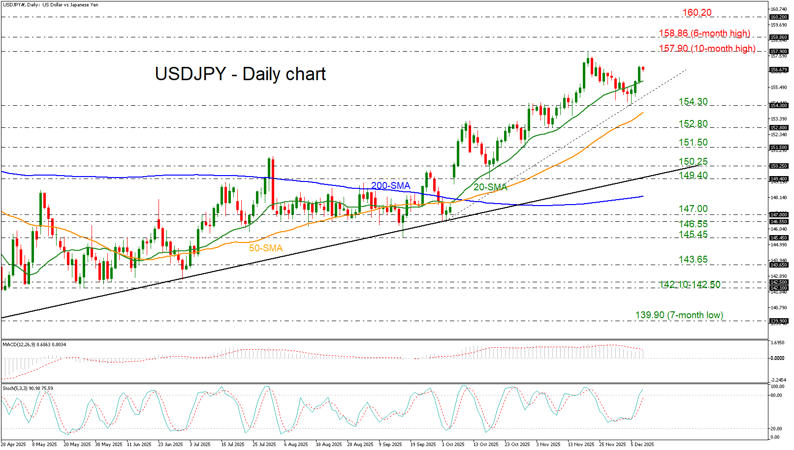 The pair is trading well above the short-term uptrend line and the 20-day simple moving average (SMA) at 155.90, with potential to reclaim the ten-month high of 157.90. If the rally extends, gains could pause near the 158.86 resistance.