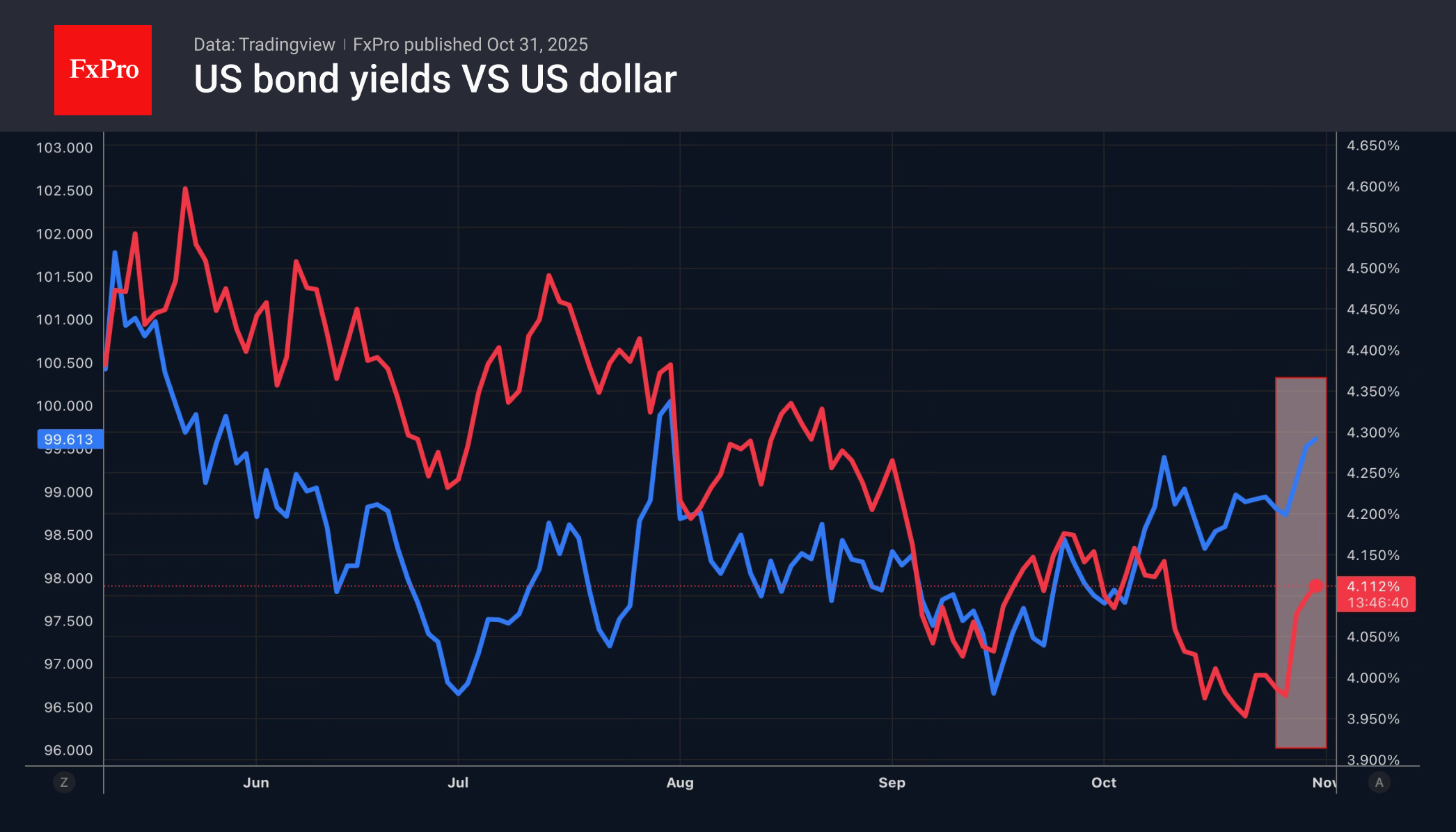On the contrary, the chances of a Fed rate cut in December fell from more than 90% at the start of the week to 67%. At the same time, Treasury bond yields are rising, which is supporting the US dollar.