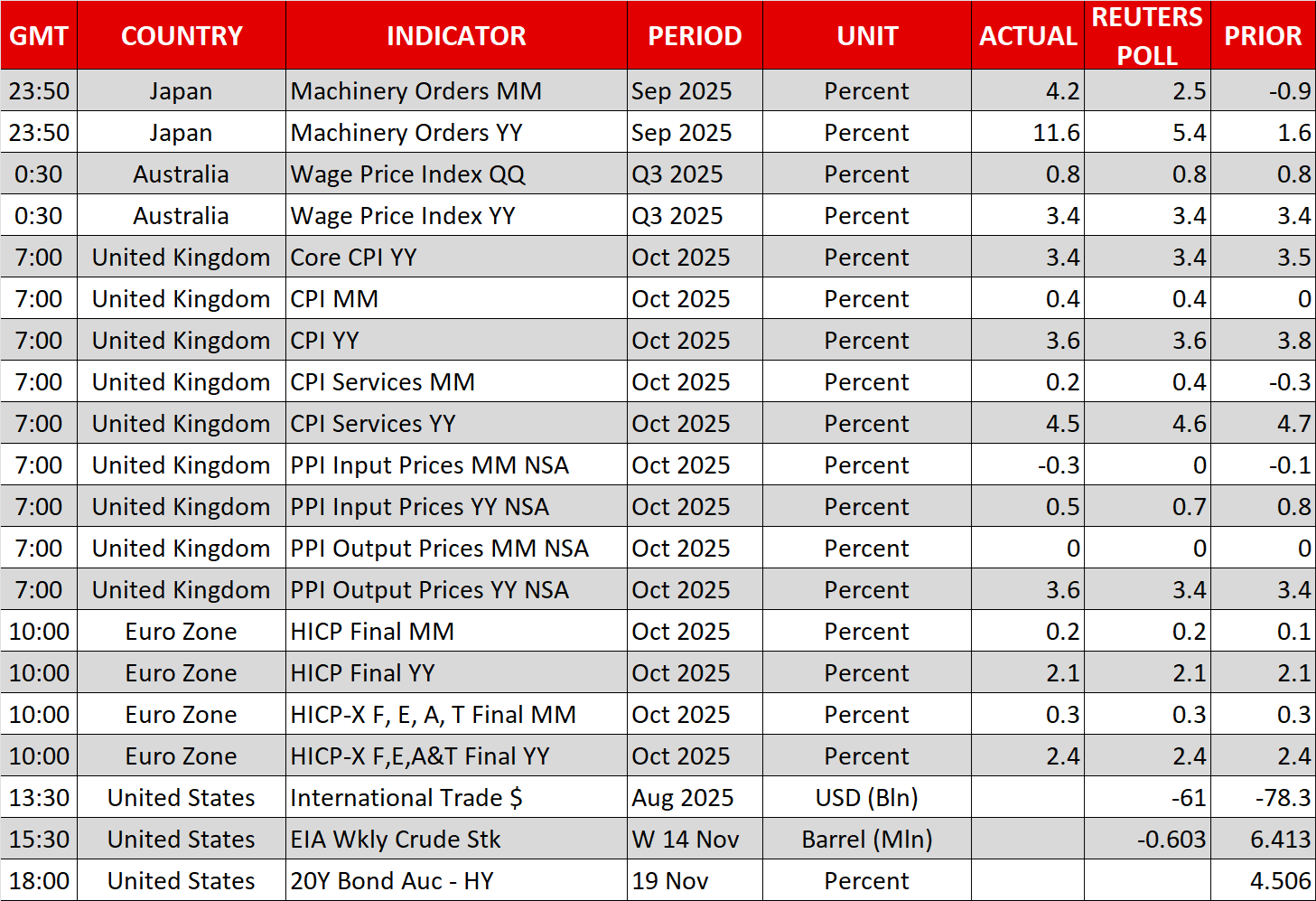 Inflation in the UK slowed in October from 3.8% to 3.6% y/y, in line with forecasts, while underlying prices rose by 3.4%, moderating from September’s 3.5% pace. Most notably, services inflation cooled more than expected to 4.5%, heightening expectations that the Bank of England will lower rates in December.