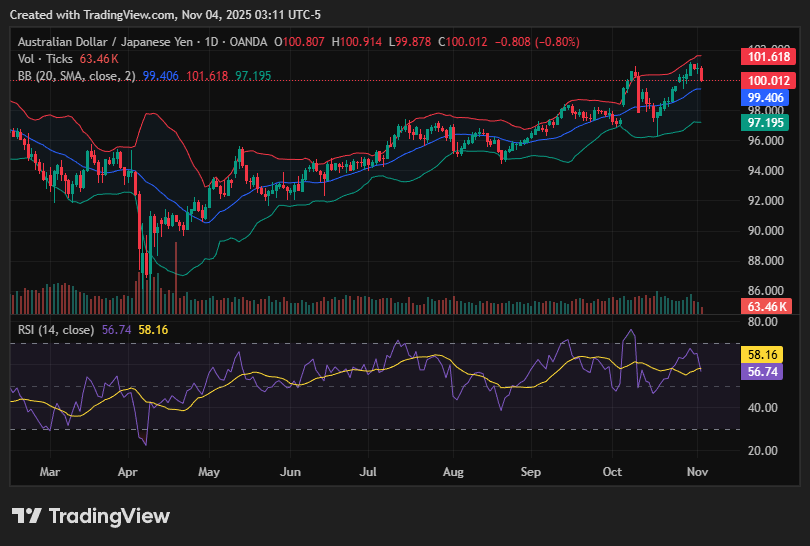 AUD/JPY slipped after the RBA held rates steady at 3.6%, triggering selling pressure on the Aussie. The pair currently trades near 96.50, as traders shift focus to Japan’s evolving rate outlook.