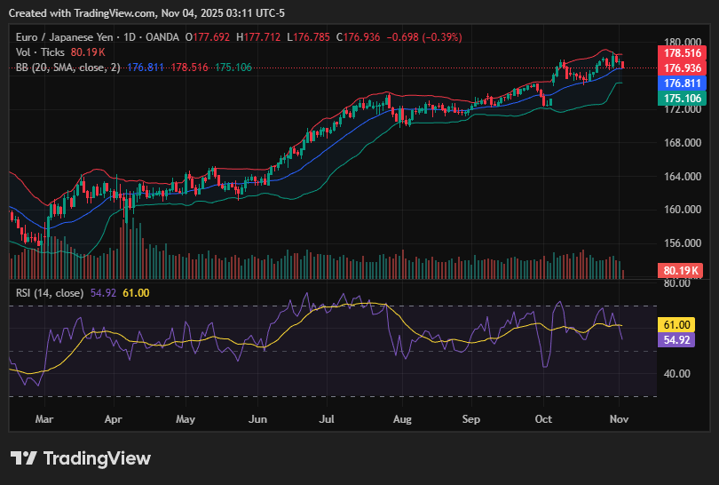 EUR/JPY slipped toward 177.00 as rising speculation about potential BoJ rate hikes strengthened the Yen. The Euro’s weakness was amplified by softer Eurozone manufacturing data, dampening risk appetite across the region.