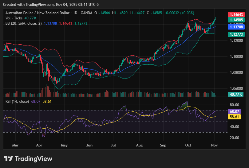 AUD/NZD hovered near 1.1480, its highest level since September 2022, as the Australian Dollar benefited from the RBA’s steady rate stance and a mildly upbeat tone on inflation control. The Kiwi lagged amid slower New Zealand growth expectations.
