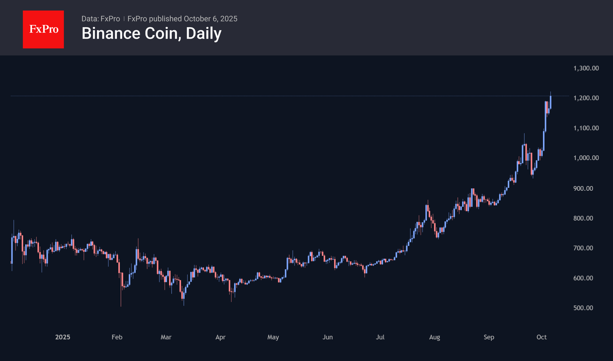 However, there are also differences from previous months. In July, XRP saw strong growth, in August, it was Ethereum, and in September, Solana made a significant leap. However, there was a clear winner all this time — BNB, which has been updating its historical highs for the fourth month in a row, shooting up 20% in seven days and 40% in 30 days, with a new record of $1,220 set on Monday.