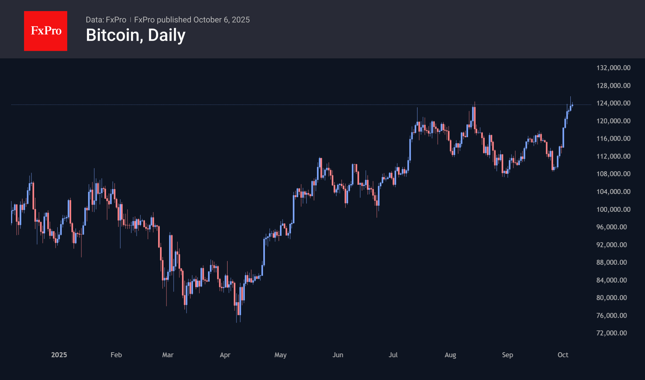 Bitcoin set a new all-time high of $125.6k, correcting to $123.6k by the start of active trading in Europe. Over seven days, BTCUSD gained over 15%, but we must consider the reduced liquidity on Sunday, which fuels the amplitude of the movement. There was a similar pattern in July and August, when a sharp increase followed the update of highs at approximately these levels in sales.