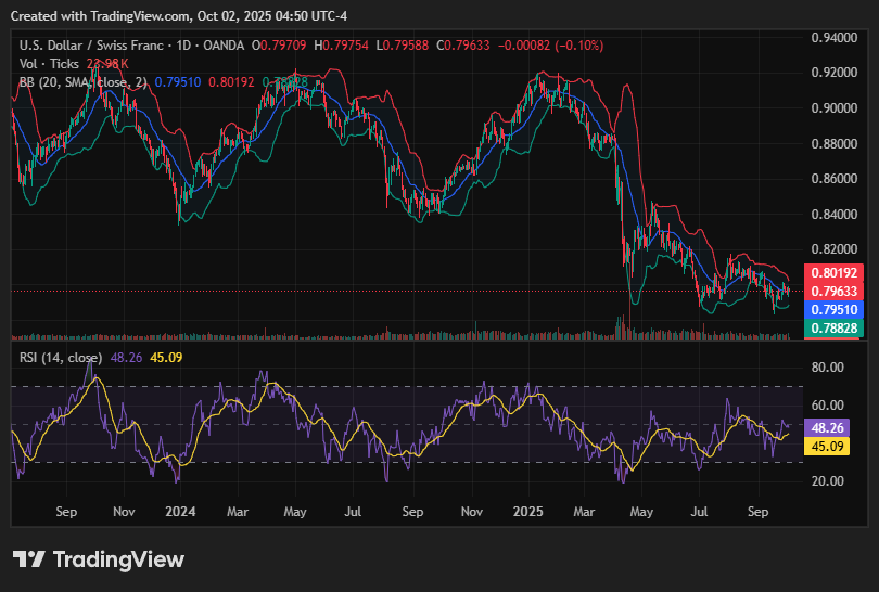 USD/CHF is consolidating around 0.7960 as traders await Swiss inflation figures that could influence the Swiss National Bank’s (SNB) cautious stance. The Dollar’s stability, despite U.S. shutdown risks, keeps the pair supported within a tight range.