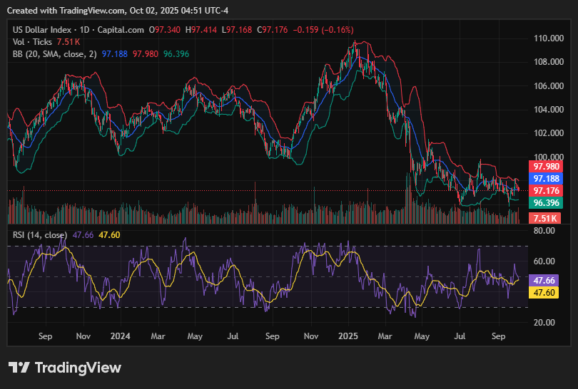 The US Dollar Index (DXY) is consolidating around 97.70–97.75, holding just above a one-week low as traders weigh ongoing U.S. government shutdown concerns and shifting expectations for Fed policy. Despite the pullback, the Dollar remains resilient within its broader trading range.