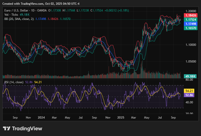 EUR/USD is trading modestly above 1.1700, supported by U.S. Dollar weakness linked to government shutdown risks. The pair remains rangebound but tilted higher as investors await key inflation data in Europe and the U.S.