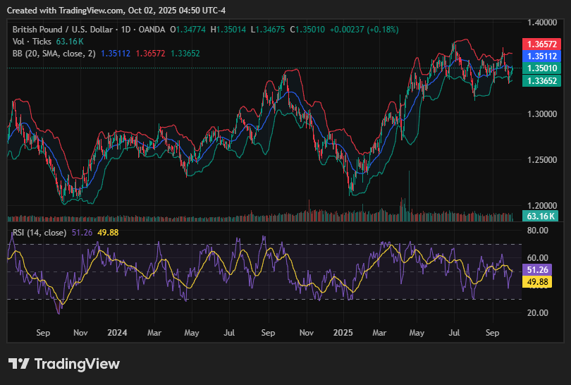 GBP/USD is steady near 1.3500, holding onto recent gains as the Bank of England maintains a cautious policy stance. The pair benefits from broad Dollar hesitation tied to U.S. shutdown risks, though upside momentum is capped by softer UK growth signals.