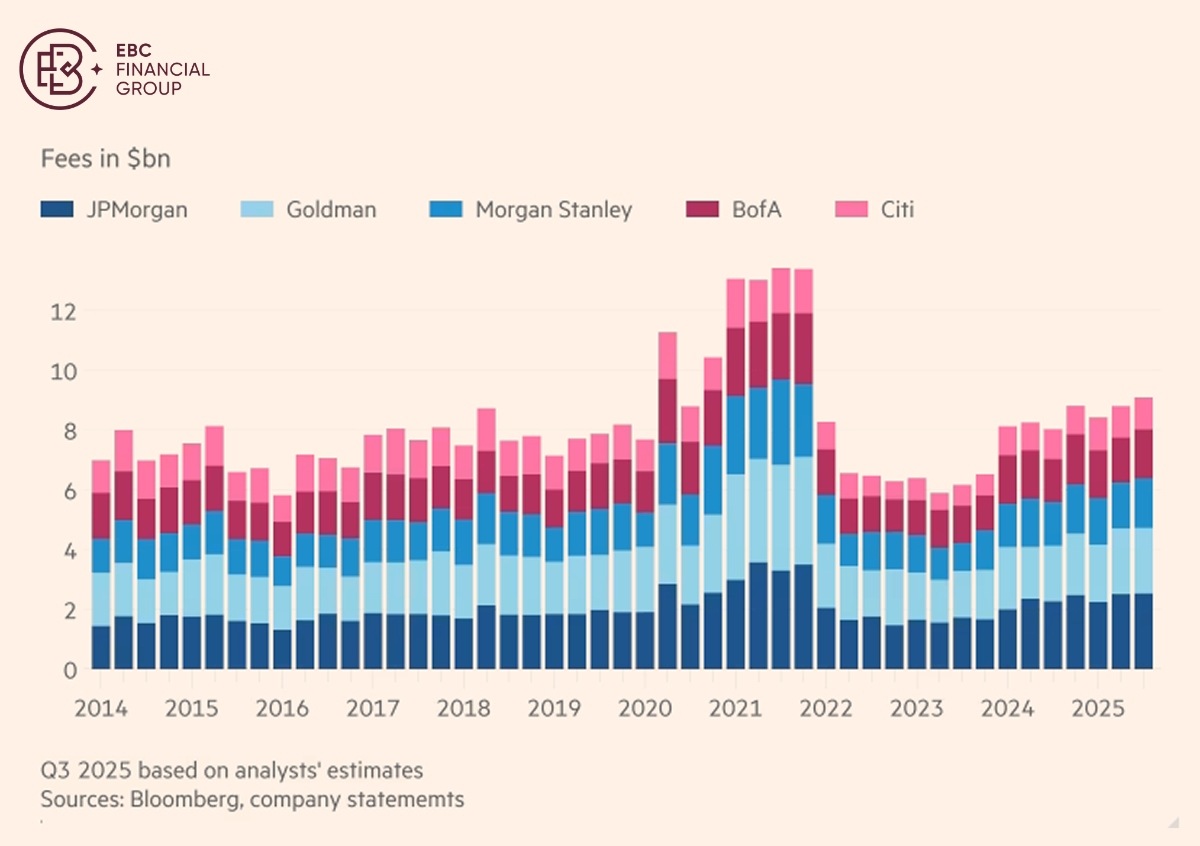 The biggest Wall Street banks are riding high into Q3 reporting season. Analysts expect profits among six major banks to climb 6% from the quarter of last year, according to Bloomberg data.