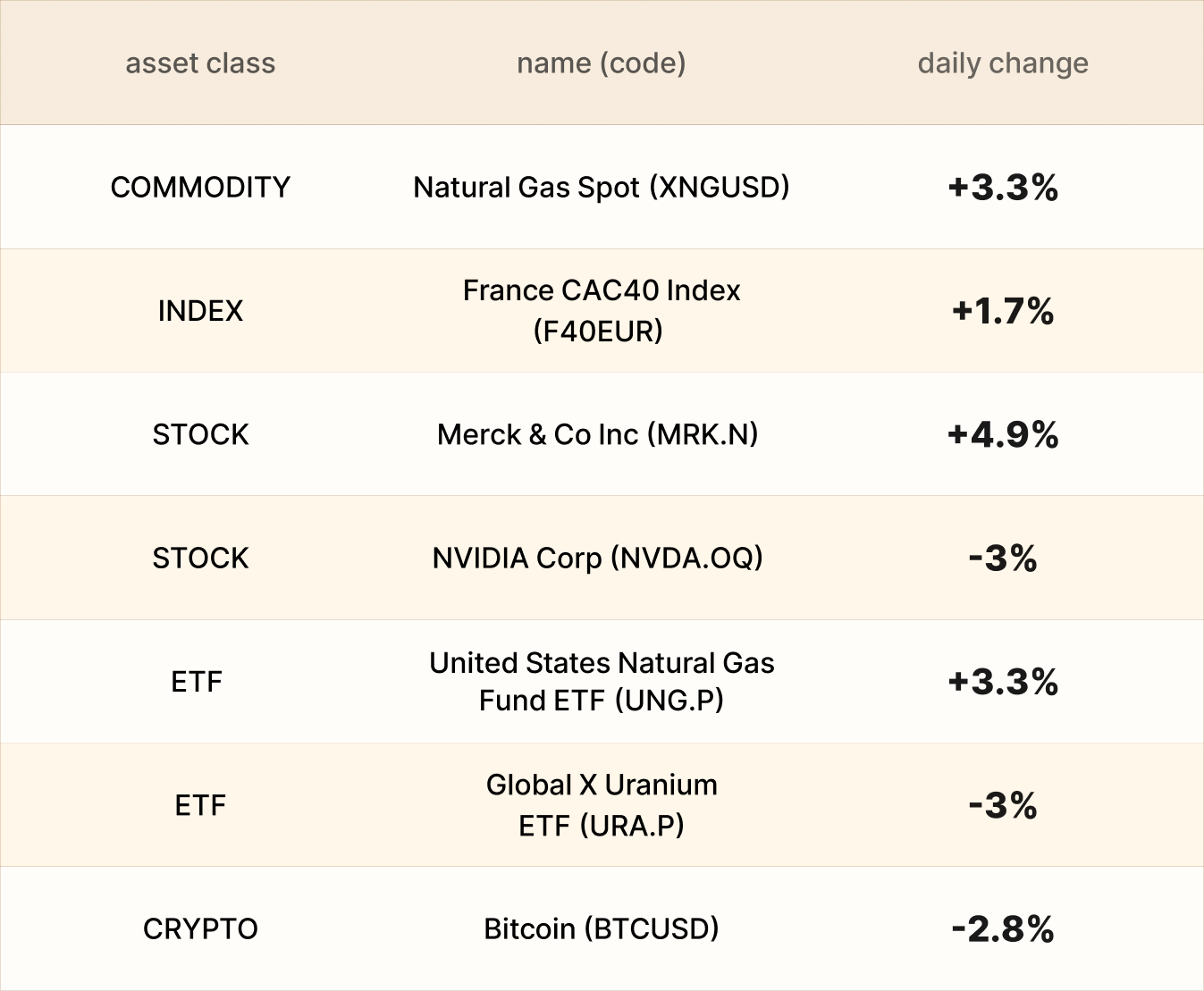 As of market close on 11 November, among EBC products, Merck & Co led gains with Q3 earnings outperforming Wall Street's predictions and a raised guidance for FY25.