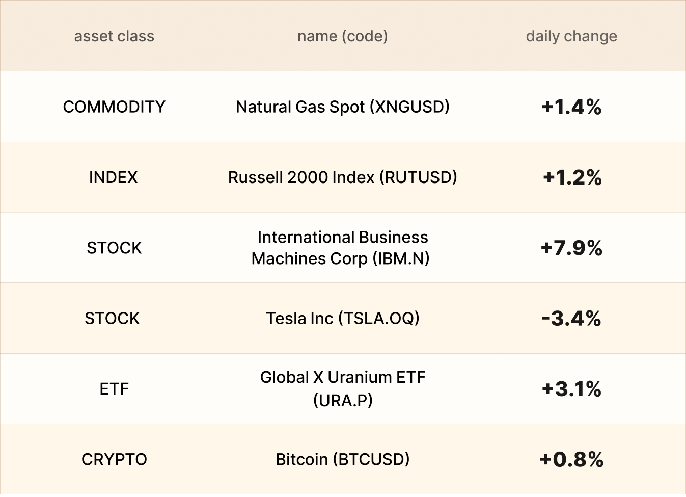 As of market close on 24 October, among EBC products, IBM shares led gains, while global X Uranium ETF also increased after Russia claimed test of nuclear-power missile.