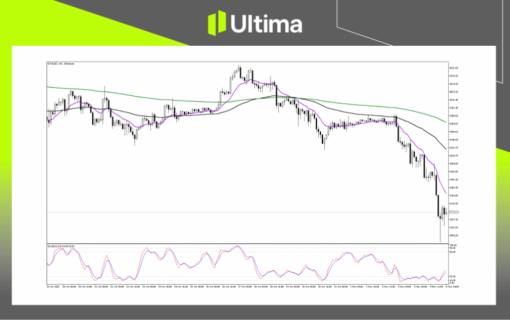Ultima Markets provides a detailed breakdown of ETHUSD price action for 5 November 2025, as Ethereum continues to trade under sustained bearish pressure following a decisive break beneath key support.