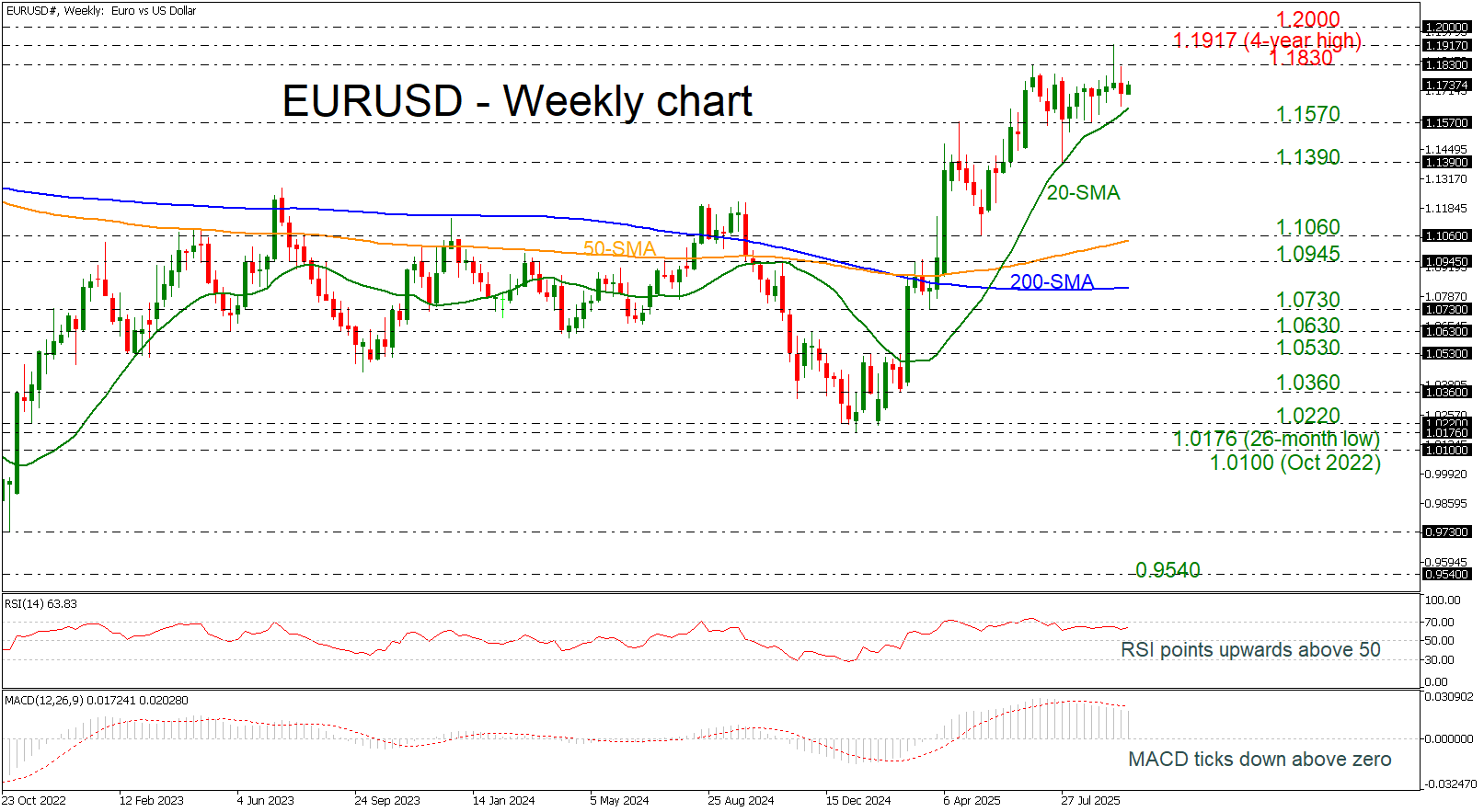 From a technical perspective, the pair is consolidating after spiking to a four-year high of 1.1917 in mid-September. A weekly close above the immediate resistance at 1.1830 could extend the bullish structure toward 1.1917 and the 200-month SMA at 1.2000.