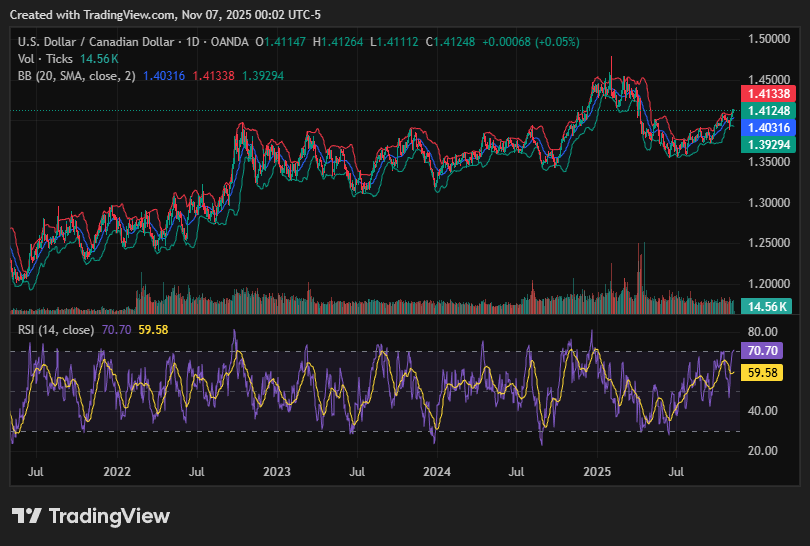 USD/CAD remains firm above 1.4100, hovering near a six-month high as traders balance soft crude oil prices against moderating expectations of imminent Fed rate cuts. The pair’s resilience reflects underlying USD strength amid subdued risk appetite and weak Canadian data momentum.