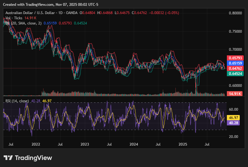AUD/USD slipped as China’s trade surplus narrowed in October, signaling weaker demand for Australian commodities. The pair traded near 0.6400, with investors staying cautious amid declining risk appetite.