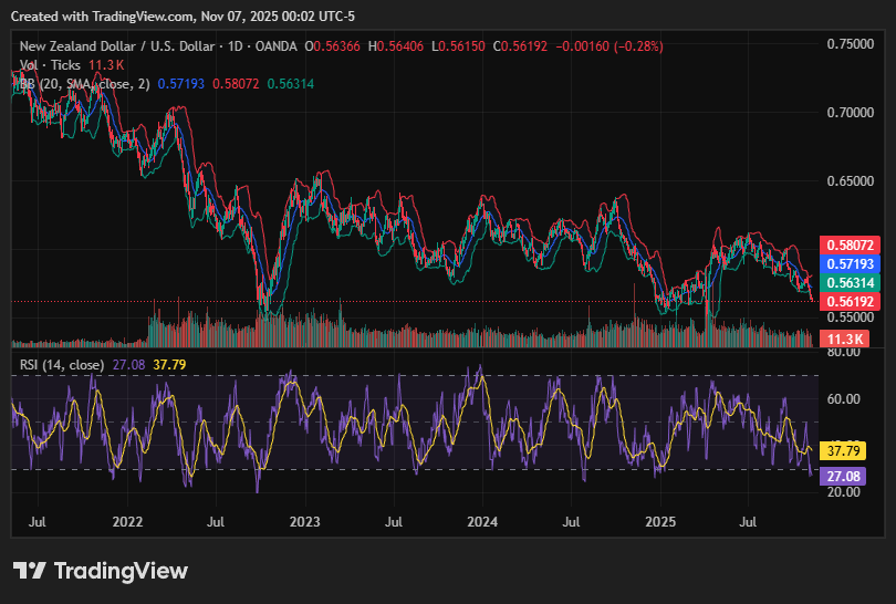 NZD/USD trades below 0.5650 as China’s October trade surplus narrowed, raising concerns about New Zealand’s export outlook. The Kiwi weakened alongside other risk-sensitive currencies as demand for U.S. Dollars returned.