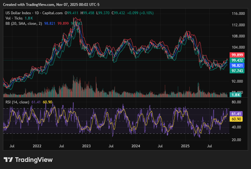 The U.S. Dollar Index rebounded near the 100 level after Thursday’s sharp drop, supported by resilient data and cautious global sentiment. The recovery signals that markets are rebalancing after overextended short-dollar positioning.