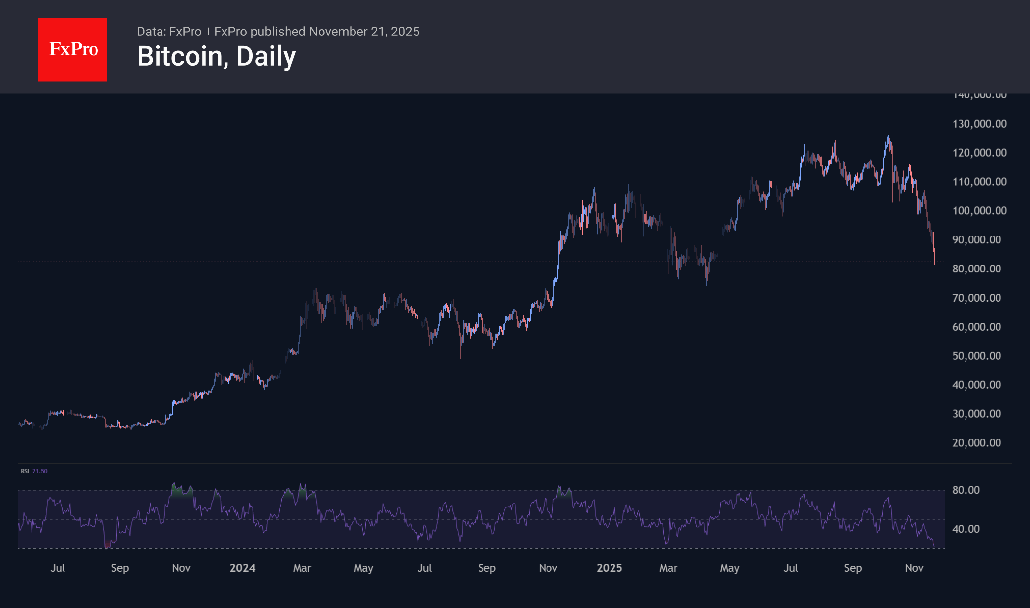 Bitcoin is trading below $83K, and at its lowest point fell to $81K, starting the day at $88K. The timing and scale of the dynamics suggest a wave of margin calls in the early hours of Friday, with an attempt at stabilisation during the European session. The price of Bitcoin has returned to the stabilisation levels seen from late February to mid-April. The RSI index on the daily charts has fallen to 20, where it last stood before the massive rally in August 2023. Touching this level in mid-2022 was not far from the price's bottom (10% higher), but the reversal then took 6 months to materialise.