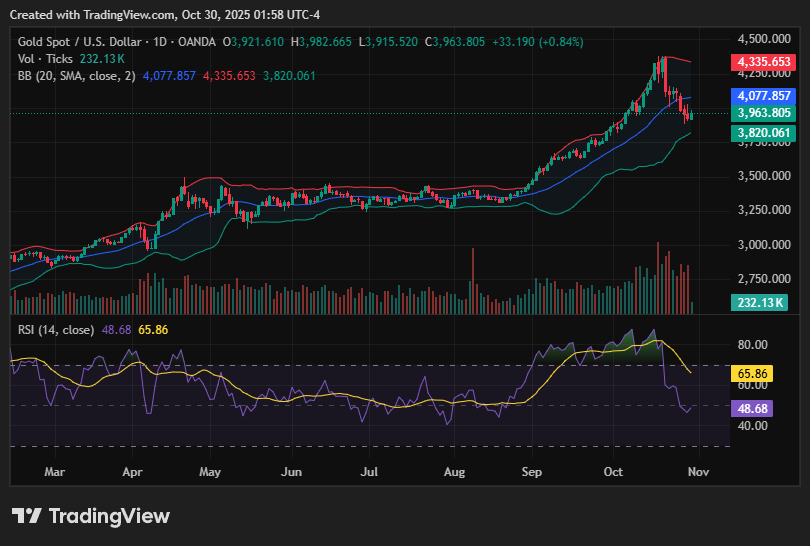 Gold holds steady near $3,950, consolidating after a modest rebound earlier in the week. Traders are treading carefully ahead of the Trump–Xi outcome, balancing safe-haven demand with improving global trade optimism.