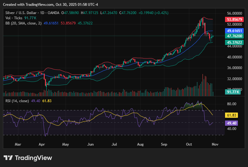 Silver trades near the mid-$47.00s, showing mixed momentum as investors balance optimism in risk assets with lingering caution ahead of trade developments.