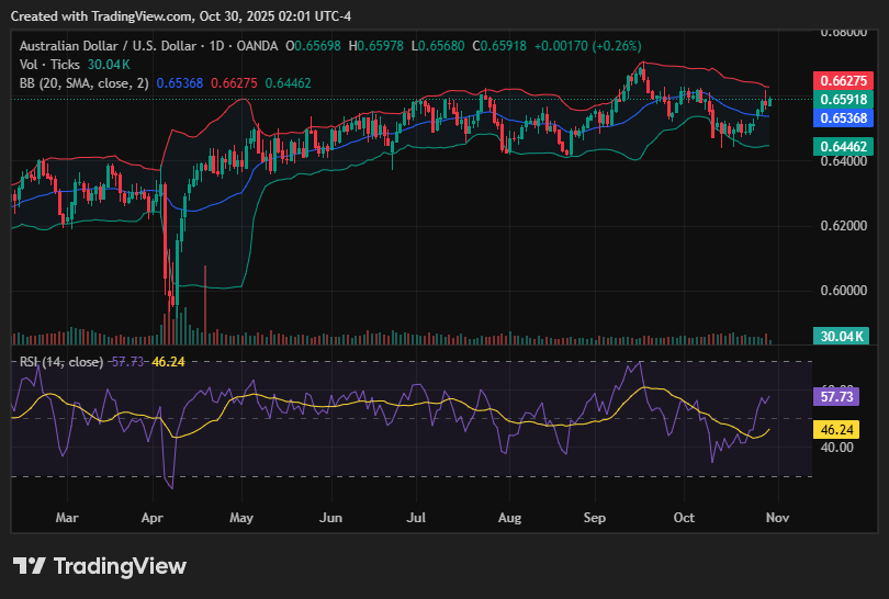 AUD/USD climbs toward 0.6600, buoyed by renewed optimism around the US–China dialogue. The Australian Dollar’s close trade ties with China make it a key beneficiary of any constructive developments.