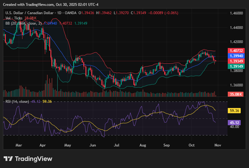 USD/CAD trades below 1.3950, weighed down by a softer US Dollar and steady crude oil prices. Traders await clarity from both the Trump–Xi meeting and recent policy stances from the Fed and BoC.