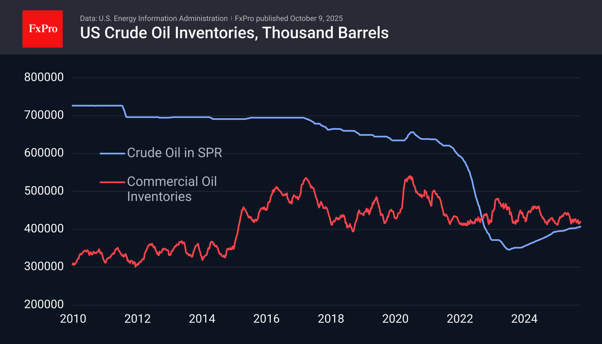 Despite a 5.5 million barrel increase in US commercial inventories over the past two weeks, stocks remain at the lower end of the range seen over the past decade, leaving considerable room for growth. The same can largely be said for the strategic reserve, which holds nearly 40% less oil than it did five years ago before the start of the active sell-off.