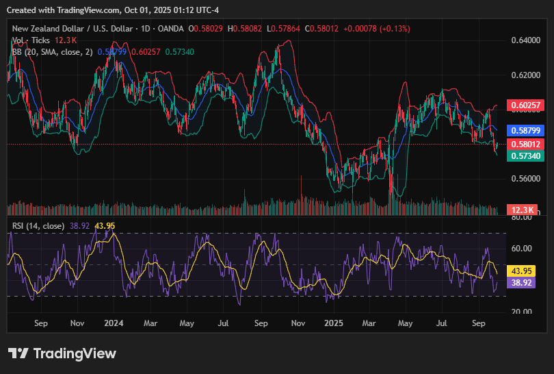 NZD/USD is trading below 0.5800, pressured by lingering U.S. Dollar strength and risk aversion tied to potential U.S. government shutdown risks. Mixed global growth signals continue to limit Kiwi demand.