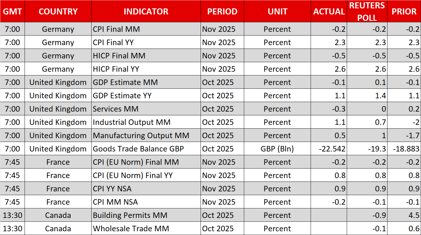 The British economy has barely grown since the summer, with worries about tax hikes ahead of the Autumn Budget weighing on consumers in October. Next week, the latest jobs and CPI numbers will be even more crucial for the Bank of England decision on December 18, but the GDP data has nevertheless pushed up the odds of a 25-bps rate cut at the meeting to just under 90%.