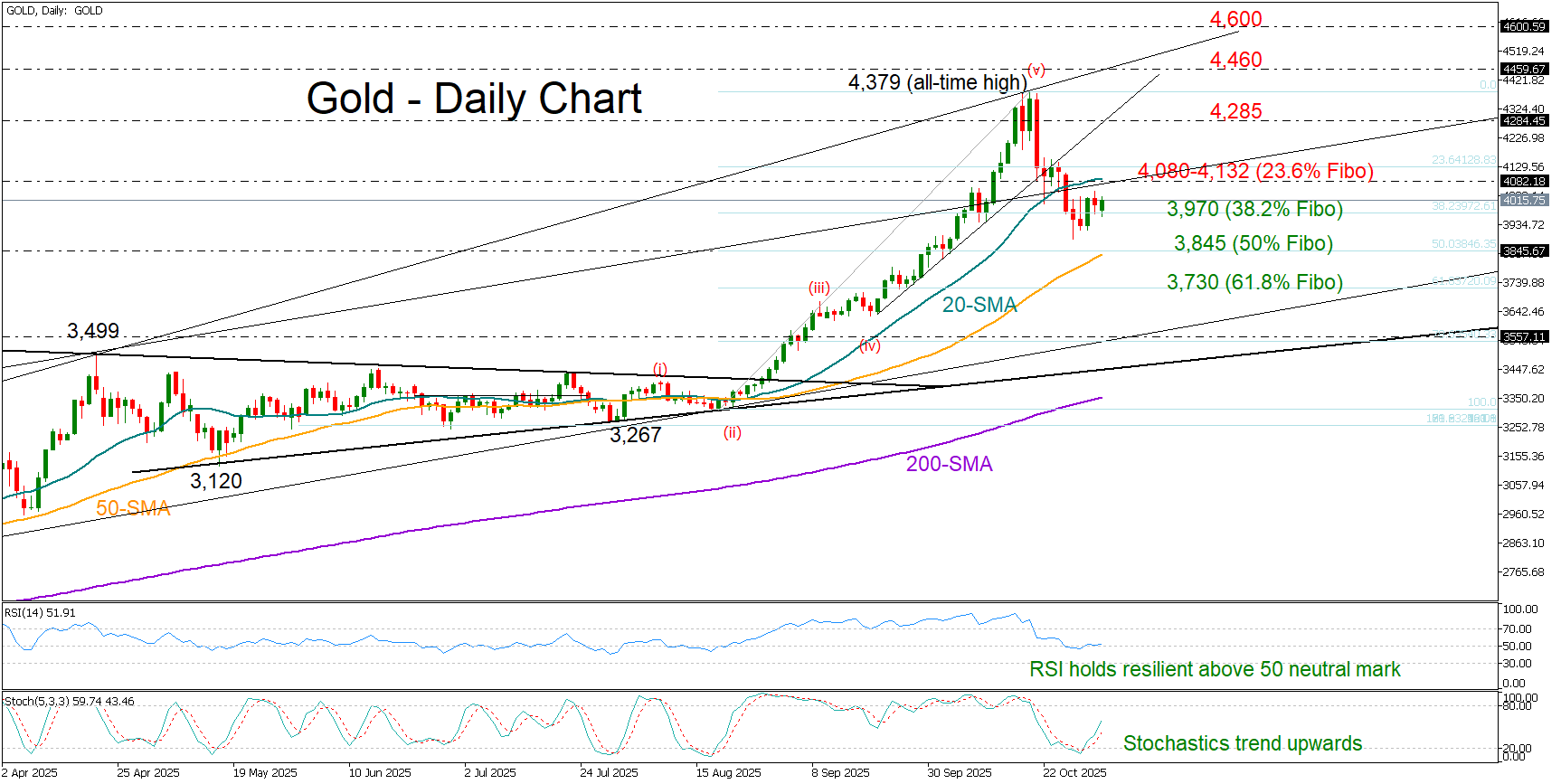 Despite the recent modest upturn, the precious metal failed to close above Wednesday’s intraday high of 4,025 and remained trapped below its 20-day simple moving average (SMA) at 4,082. Yet, the bulls could make another attempt, as the RSI is holding resiliently above its neutral 50 mark and the stochastic oscillator is trending upward.