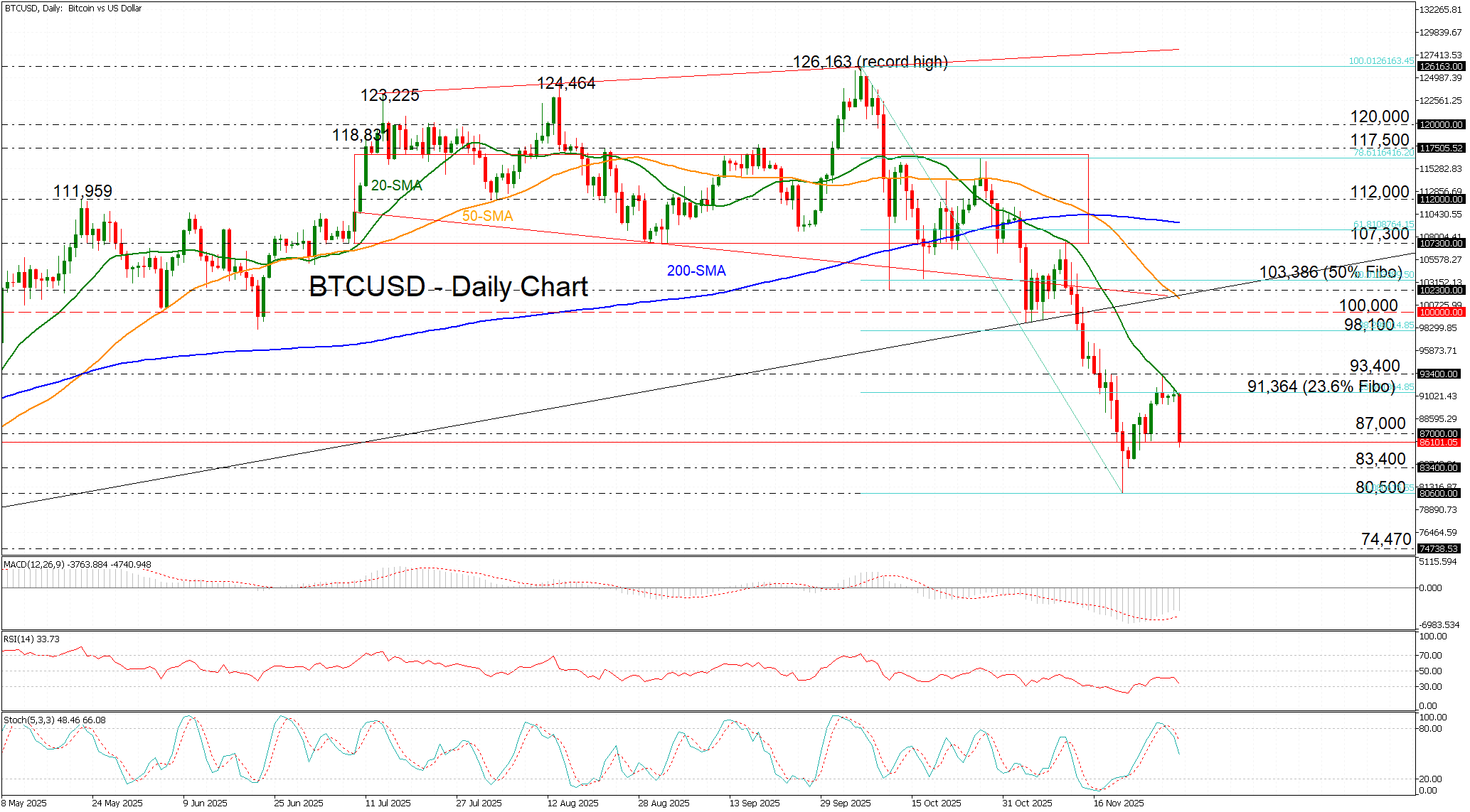 Currently, BTCUSD is trading near 86,100 after encountering strong resistance at the 20-day simple moving average (SMA), which aligns with the 23.6% Fibonacci retracement of the sharp pullback from October’s record peak to November’s monthly low at 91,364. The bears are now eyeing 83,400 and 80,500 as the next critical support levels, with a potential revisit of the April 7 low at 74,470 if selling pressure persists.