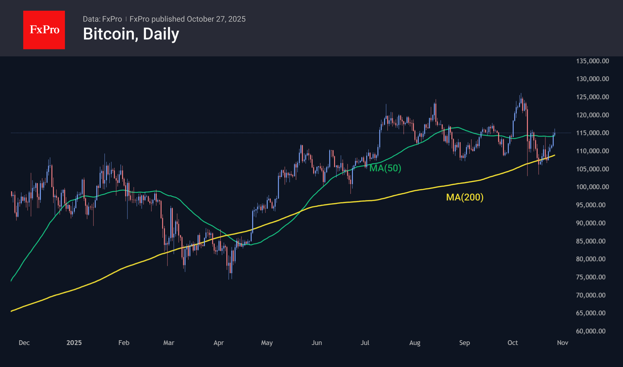 Bitcoin rose above $116K on Monday morning, pushing off the 200-day MA as support last week and exceeding the 50-day moving average at the start of the new week. The $117K–120K area is a strong resistance zone. The rallies in August and early October proved to be unsustainable. Perhaps, by bouncing off the 200-day MA, BTC, as it did in April, will gain enough momentum to renew its highs.
