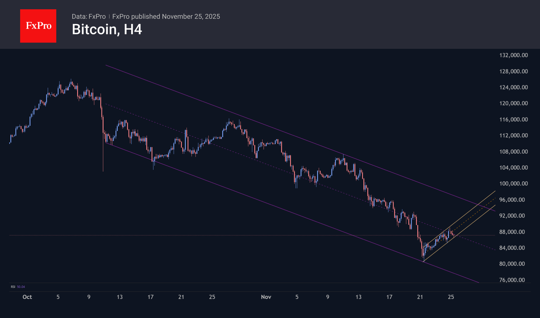 Bitcoin rose to $89K at its peak last night but fell back to $87K in the morning. Since last Friday, BTCUSD has formed an upward trend, rebounding from its upper limit overnight. However, over the past seven weeks, Bitcoin has still had a sharply negative dynamic, within which the latest growth looks like a rebound. In this case, it would be wise to closely monitor signs of a rebound exhaustion. The first such signal would be a consolidation below the $85K level.
