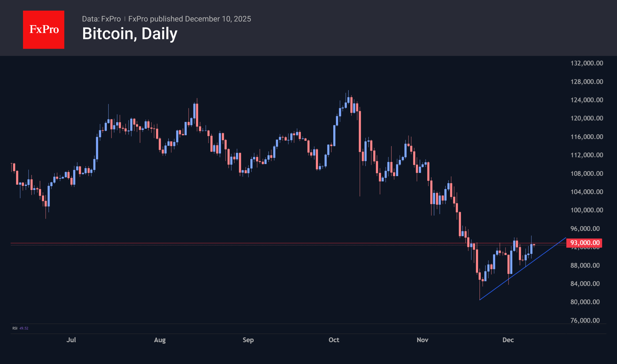 The crypto market capitalisation increased by 2.5% to $3.16 trillion following Bitcoin's surge, surpassing the previous local maximum of over $3.21 trillion. Strictly speaking, we have observed a series of higher local highs and lows since 21 November. Moreover, the market is moving beyond the medium-term downward range that has dominated since early October. However, to definitively classify the rebound as the start of capitalisation growth, it needs to surpass $3.32 trillion, which is 6% above current levels.