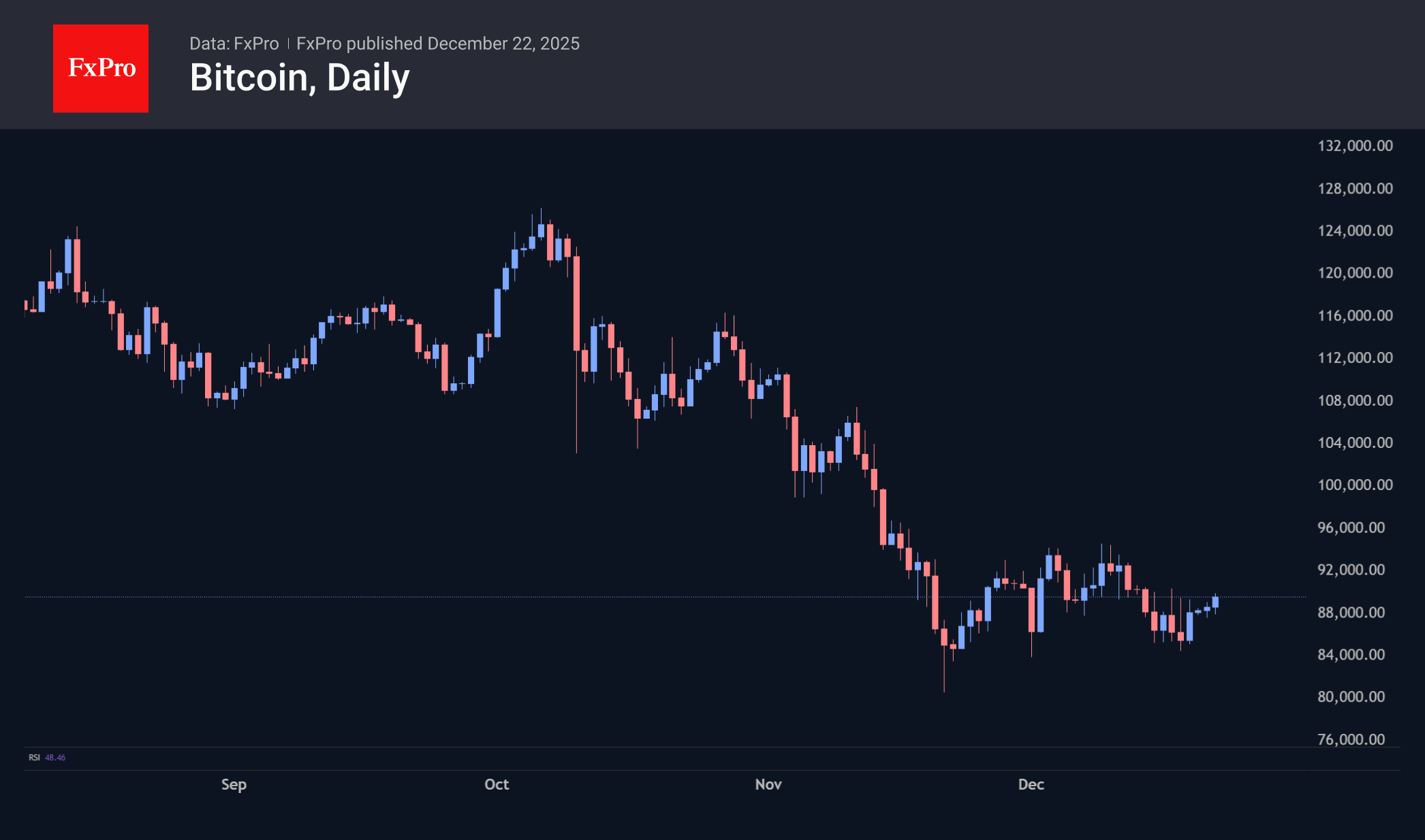 Bitcoin is trading at $89K, once again at the upper limit of the range that has been in effect since the beginning of last week. The short-term positive momentum may be misleading, and the broader picture of disappointment compared to hopes at the start of the year should not be overlooked. Bitcoin is 30% below its peak and trading at a level lower than it was at the beginning of 2025. Attempts to bring YTD momentum to zero are little consolation in this context.