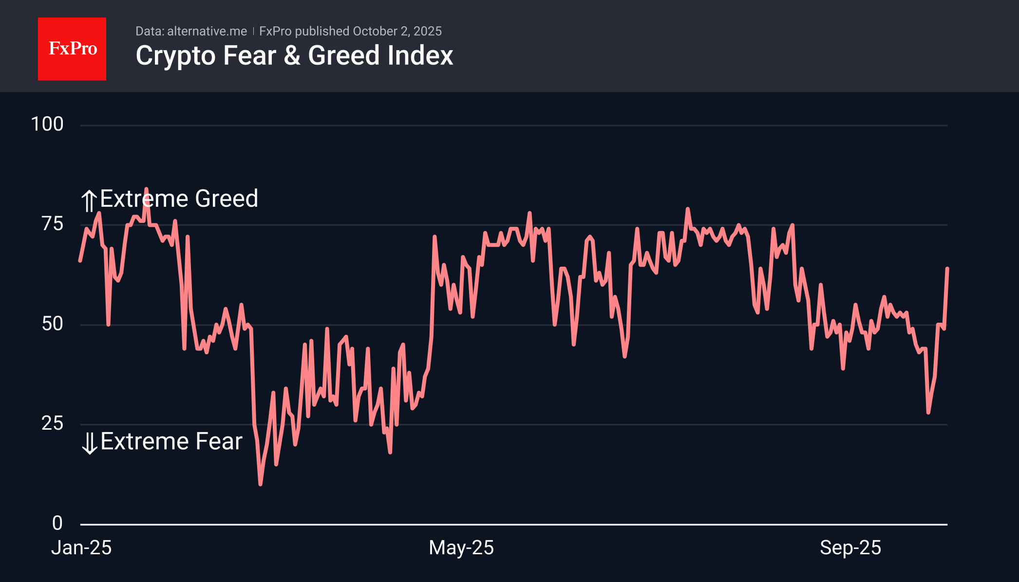 The cryptocurrency market capitalisation soared by 4% over the past day to $4.07 trillion. The capitalisation has soared into the extreme zone, above which it was only briefly in mid-August and mid-September. Cryptocurrency investors are convinced that the US government shutdown is not dampening risk appetite, and macroeconomic data is pushing the Fed to ease its policy further.The sentiment index rose to 64 (greed), reaching its highest level in the last six weeks. However, the index is far from extreme greed, leaving significant potential for further strengthening.